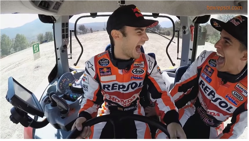 Dua rider Repsol ini menikmati masa pasca balapan dengan mengendarai traktor dengan riang gembira, dengan gelak tawa mirip masa kanak-kanak, not bad untuk refreshing setelah tegang dalam perebutan gelar dunia.