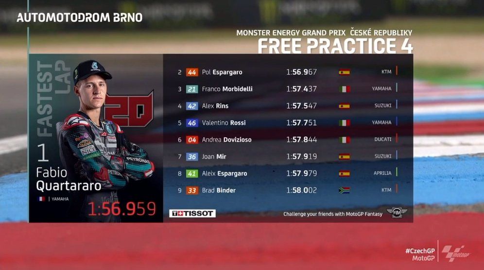 RiderTua.com - Sesi FP4 GP Brno Republik Ceko di dominasi oleh pembalap Petronas. Yamaha, Rossi, dan Suzuki terlihat memiliki kecepatan balapan ( race pace)...