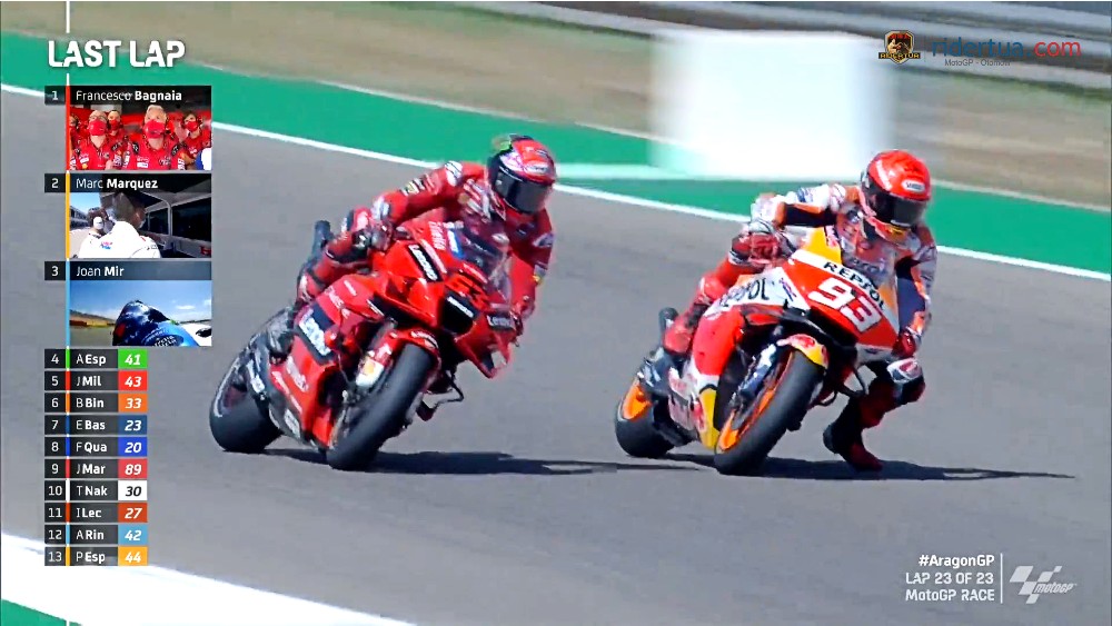 RiderTua.com – Bagnaia tidak merasa terintimidasi di Aragon, meskipun Marc Marquez selalu ‘menempel’ di roda belakang bagai bayangan selama 23 lap. Pecco selalu membaca gerak-gerik Marc dari telingannya yang berfungsi sebagai ‘spion’.. “Ketika saya mendengar suara mesinnya mendekat, saya curiga dia akan menyalip. Saya tahu dia siap untuk manuver menyalip yang gila dan tak terduga kapan saja. Tapi saya curiga dia hanya akan menyerang saya di bagian akhir balapan. Karena slipstream banyak membantunya,” kata Pecco.. Late braking dan memblokir racing line sisi dalam adalah cara ampuh meredam manuver overtaking Marquez.. Namun memang tidak mudah menjinakkan raja Aragon, simak perjalanan Bagnaia meredam Marc di balapan rumahnya..