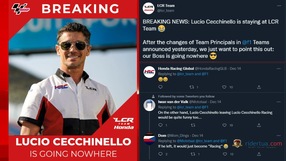 RiderTua.com – Di Formula 1, empat tim balap kehilangan bos tim mereka. Banyaknya pergantian personel ini membuat tim MotoGP milik Lucio Cecchinello melontarkan candaan di media sosial. Tim LCR Honda memposting foto dengan tulisan BREAKING dan mengungkapkan berita luar biasa di bawahnya, ‘Lucio Cecchinello tidak ke mana-mana’.