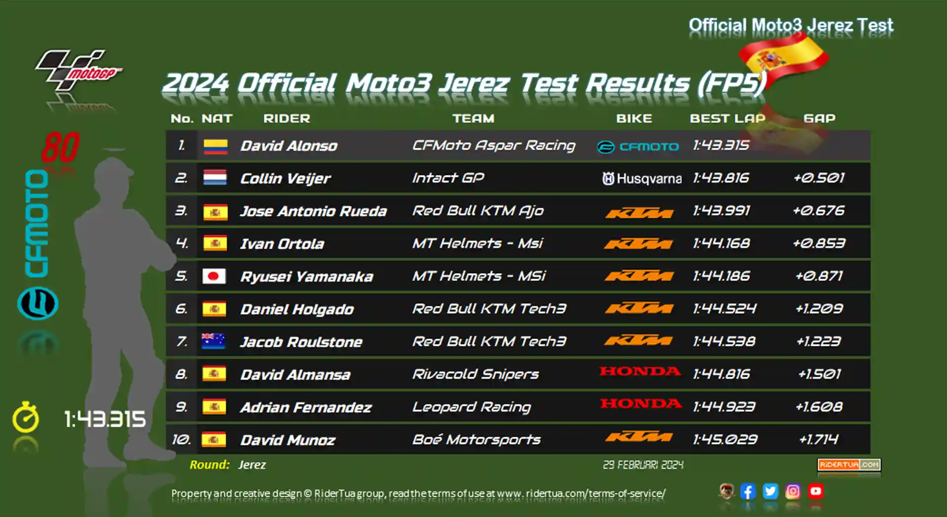 RiderTua.com, Jerez de la Frontera — Official Moto3 Jerez Spain 2024 Test Results, second day of the fifth session (FP5): Thursday (29/2/2024), CFMoto Aspar Racing rider, David Alonso scored the best lap +0.501 seconds faster than Collin Veijer (Intact GP) at the 2024 Spanish session at the Jerez Circuit, at the Spanish Moto3 test. ‘Veijer’ was the ‘runner-up’ with a time of 1 minute 43.816 seconds in this practice session, while Jose Antonio Rueda from Red Bull KTM Ajo’s time of 1 minute 43.991 seconds during the time attack meant he could only be ranked in the top three fastest.