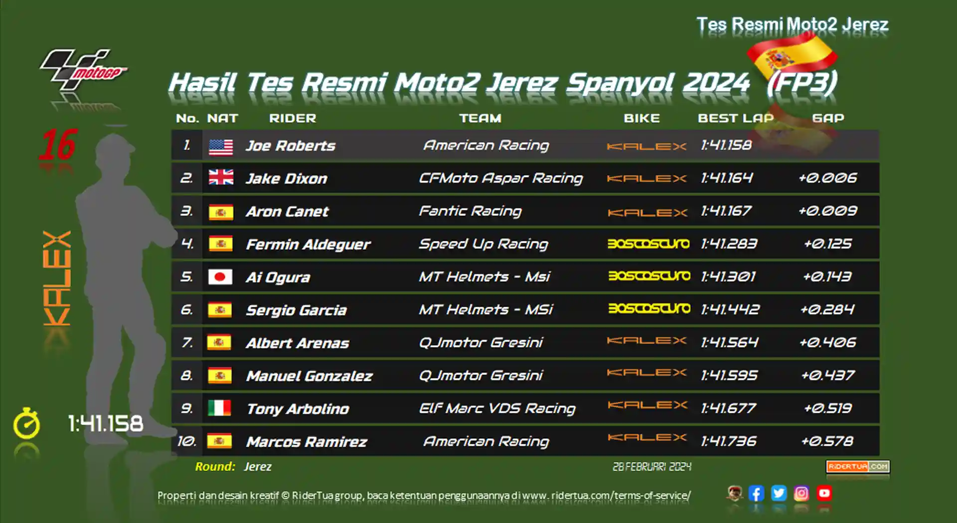 RiderTua.com, Jerez de la Frontera — Hasil Tes Resmi Moto2 Jerez Spanyol 2024 hari pertama sesi ketiga (FP3) : Rabu (28/2/2024), Joe Roberts menutup sesi tes resmi ketiga dengan menjadi yang tercepat. Rider American Racing itu sukses menorehkan waktu terbaiknya di 1 menit 41.158 detik. Di peringkat ke-2 ada Jake Dixon (CFMoto Aspar Racing ) dengan catatan waktu 1 menit 41.164 detik. Sementara itu Aron Canet (Fantic Racing) sukses mengikuti di posisi ke-3 dengan torehan waktu 1 menit 41.167 detik.