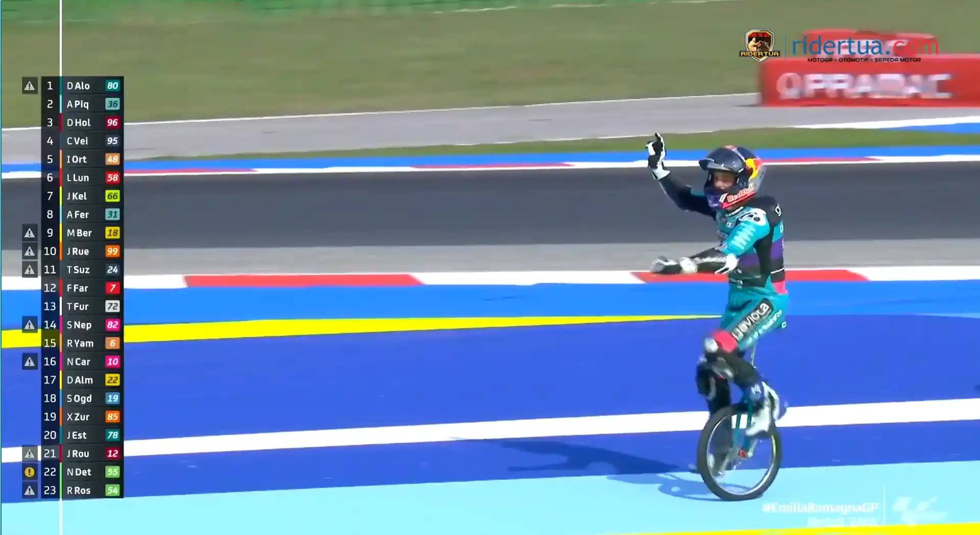 RiderTua.com, Misano Adriatico, Hasil Race Moto3 Emilia Romagna 2024 — David Alonso akhirnya merebut kemenangannya di balapan Moto3 Emilia Romagna 2024. Pebalap andalan CFMoto Aspar Racing itu mampu melesat terdepan hingga garis finish. Dalam race yang berlangsung di Sirkuit Misano , Minggu (22/9/2024), ‘Alonso’ mengalahkan Angel Piqueras (Leopard Racing) dengan selisih waktu +0.175 detik dan pebalap dari tim Intact GP, Collin Veijer dari negara Belanda dengan gap +0.367 detik dan harus puas berada di posisi ke-3.