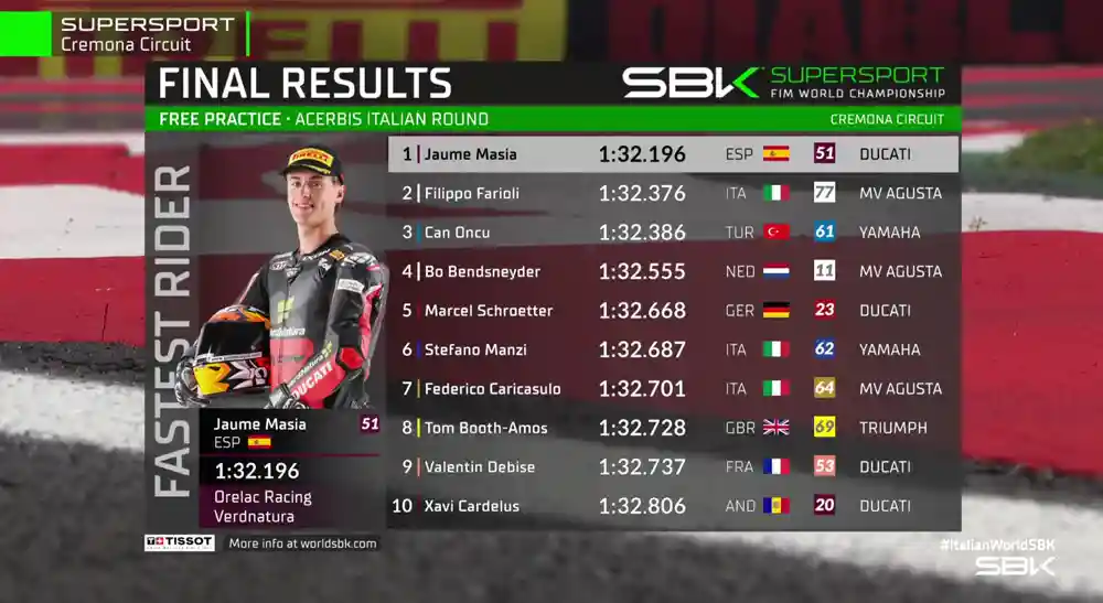 RiderTua.com, Cremona Circuit – Hasil Latihan Bebas WSSP Italia 2025: Jumat, 02 Mei 2025, Dalam sesi Free Practice WSSP Italia, Jaume Masia menjadi yang tercepat dan memuncaki catatan waktu dengan 1’32.196 menit, dengan mengendarai motor Ducati Panigale V2-nya. Pembalap asal Italia, Filippo Farioli menjadi tercepat kedua setelah berhasil mendekati waktu Jaume dengan selisih +0.180, atau dengan waktu 1’32.376 menit. Di peringkat tiga besar ada pembalap dengan nomor #61 yakni Can Oncu dari Yamaha BLU CRU Evan Bros Team dengan menorehkan waktu terbaik untuk latihan bebas kali ini dengan 1’32.386 menit.