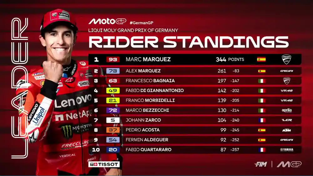 RiderTua.com – Klasemen MotoGP usai Race GP Jerman Sachsenring 2025.. Marc Marquez masih menjadi raja Sachsenring (lagi) setelah bergabung dengan Ducati.. Dia memimpin balapan dari awal hingga akhir, tanpa kesalahan dan tanpa henti.