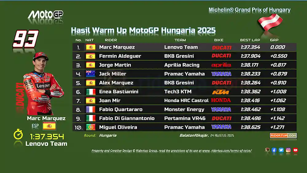 RiderTua.com, Balatonfőkajár — Hasil Warm Up MotoGP Hungaria 2025 : Minggu (24/8/2025), Rider Lenovo Team, Marc Marquez mencatatkan waktu tercepat dalam WUP Grand Prix Hungaria untuk kelas MotoGP.