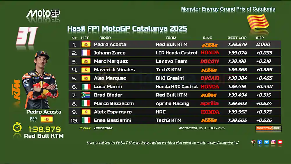 RiderTua.com, Montmeló — Hasil FP1 MotoGP Barcelona 2025 : Jumat (05/9/2025), Hasil latihan bebas pertama (FP1) MotoGP Barcelona 2025 menempatkan Red Bull KTM di posisi terdepan dengan Pedro Acosta sebagai rider tercepat.