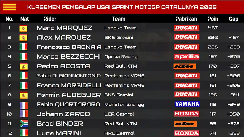 KLASEMEN PEMBALAP USAI SPRINT MOTOGP CATALUNYA 2025