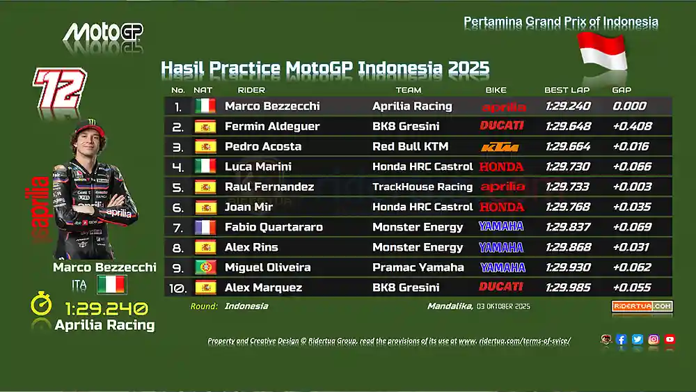 RiderTua.com, Mandalika — Hasil Practice MotoGP Indonesia 2025 : Jumat (03/10/2025), Hasil latihan (Practice) MotoGP Indonesia 2025 menempatkan Aprilia Racing di posisi terdepan dengan Marco Bezzecchi sebagai rider tercepat. Memimpin 10 pembalap yang lolos ke Q2.. Menariknya Marc Marquez dan Pecco Bagnaia Tidak lolos ….