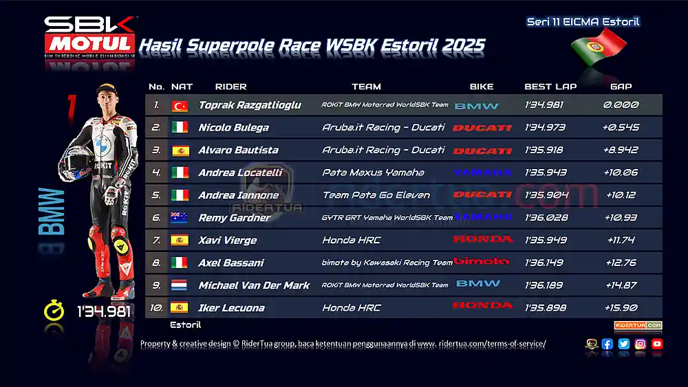 RiderTua.com, Estoril – Minggu (12/10/2025), Hasil Superpole Race WSBK Estoril 2025 balapan singkat…. Toprak Razgatlioglu mendominasi balapan “sprint” dengan luar biasa di race WSBK Estoril…. Pembalap andalan ROKiT BMW Motorrad WorldSBK Team itu mampu membukukan kemenangan dengan tanpa cela…
