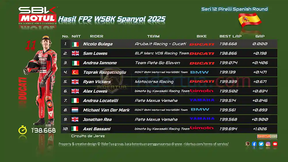 RiderTua.com, Circuito de Jerez – Jumat (17/10/2025), Hasil FP2 WSBK Spanyol 2025. Dalam sesi FP2 WSBK Spanyol Nicolo Bulega mampu membuktikan menjadi yang tercepat dan memuncaki catatan waktu dengan 1’38.668 menit, dengan mengendarai motor Ducati Panigale V4R-nya.