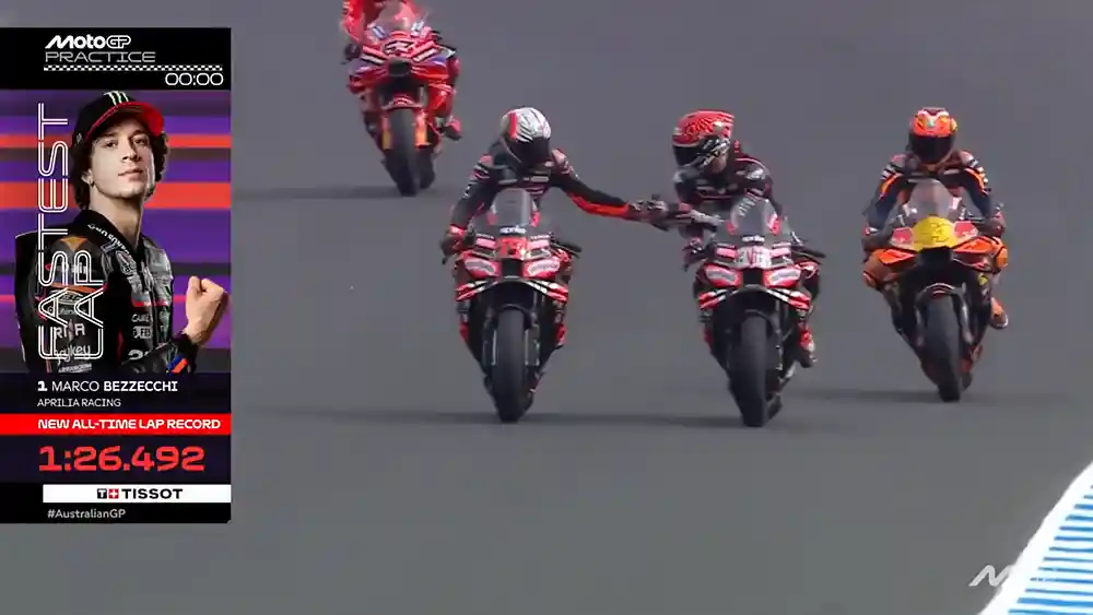 RiderTua.com – Marco Bezzecchi tampil mengesankan selama sesi pra kualifikasi Jumat sore di Phillip Island. Rider Aprilia itu berhasil mencetak rekor lap baru dengan catatan waktu 1:26,492 menit unggul 0,291 detik dari rekannya sesama Aprilia Raul Fernandez (tim Trackhouse Racing) yang berada di posisi ke-2.