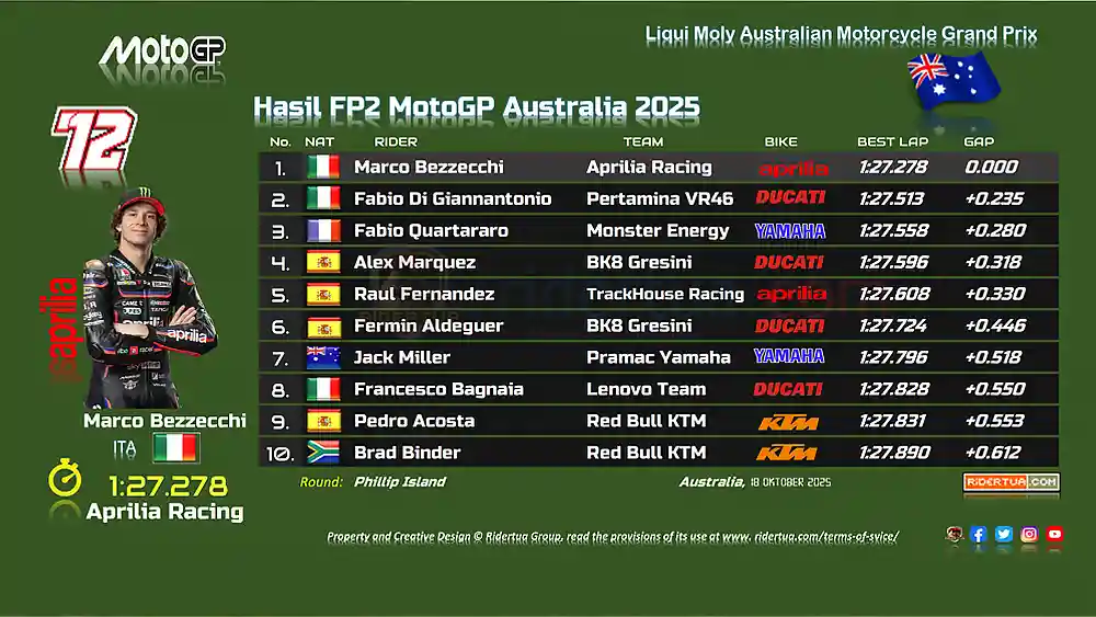 RiderTua.com, Victoria — Hasil FP2 MotoGP Australia 2025 : Sabtu (18/10/2025), Marco Bezzecchi memimpin di latihan bebas kedua MotoGP Australia 2025. ‘Bez’ membukukan lap tercepat 1 menit 27.278 detik (pecahkan rekor kemarin) dan berada di posisi teratas di Latihan Bebas MotoGP di sirkuit Phillip Island Australia.