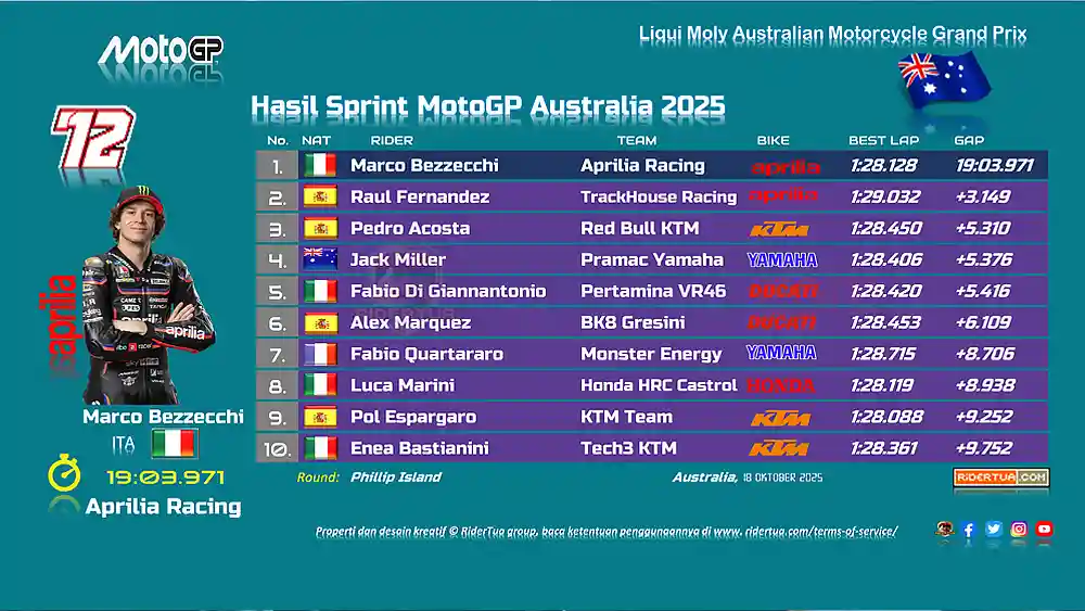 RiderTua.com, Victoria: Hasil Sprint Race MotoGP Australia 2025 — Rider Aprilia Racing, Marco Bezzecchi, berhasil memenangkan balapan sprint MotoGP Australia 2025 di Sirkuit Phillip Island pada Sabtu (18/10/2025) dengan menempuh total waktu 19:03.971.