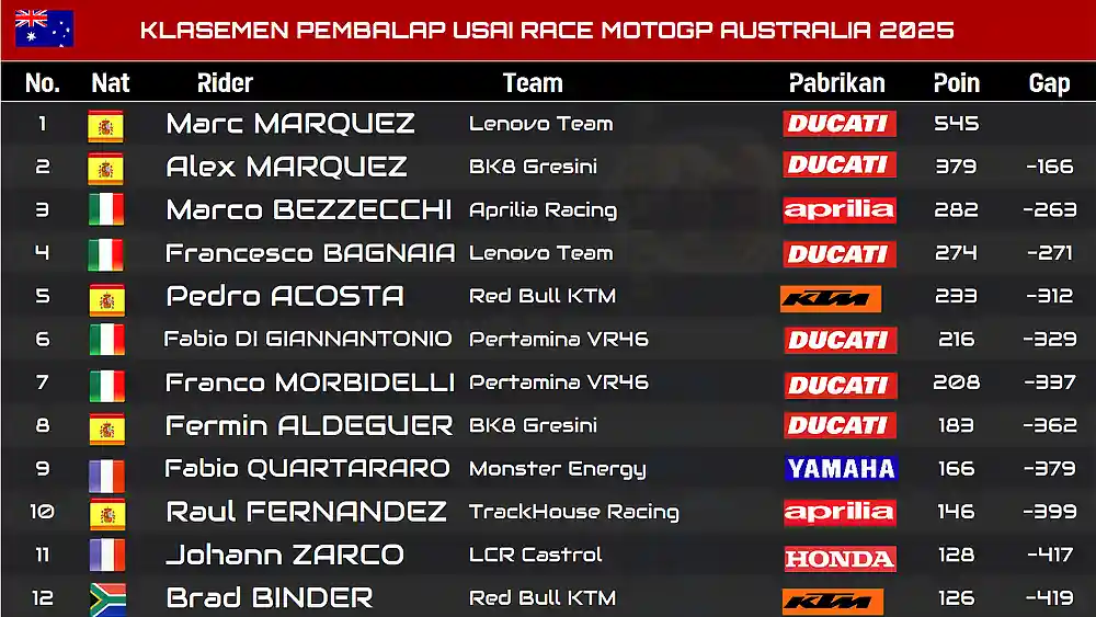 KLASEMEN PEMBALAP USAI RACE MOTOGP AUSTRALIA 2025