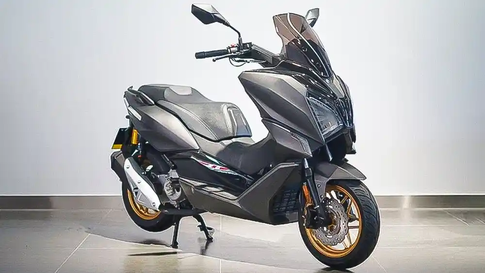 Kelas & Desain | Skuter maxi 300cc dengan bodi besar, lampu utama lebar, dan kaca depan smoke tinggi |
