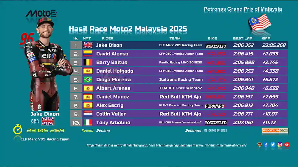 RiderTua.com, Sepang: Hasil Race Moto2 Malaysia 2025 — Jake Dixon akhirnya merebut kemenangannya di balapan Moto2 Malaysia 2025. Pebalap andalan ELF Marc VDS Racing Team itu mampu melesat terdepan hingga garis finish.