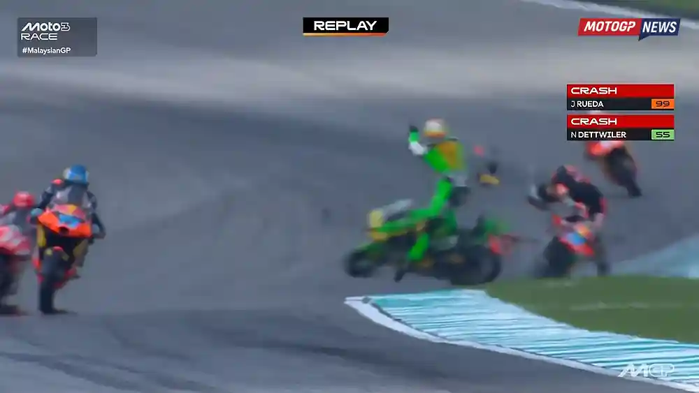 RiderTua.com – Crash horor yang mengerikan antara Noah Dettwiler dan Juara Dunia Moto3 yang baru saja dinobatkan Jose Antonio Rueda di Sepang, sangat mengejutkan sekaligus memprihatinkan. Seperti yang diberitakan, pebalap asal Swiss itu ditabrak dari belakang oleh Rueda saat sighting lap sebelum balapan Moto3.