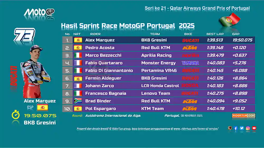 RiderTua.com, Portimao: Hasil Sprint Race MotoGP Portugal 2025 — Rider BK8 Gresini, Alex Marquez, berhasil memenangkan balapan sprint MotoGP Portugal 2025 di Sirkuit Autódromo Internacional do Algarve pada Sabtu (08/11/2025) dengan menempuh total waktu 19:50.075.