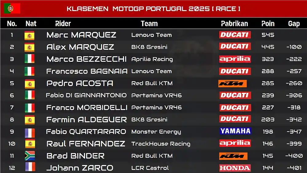 KLASEMEN MOTOGP PORTUGAL 2025 [ RACE ]