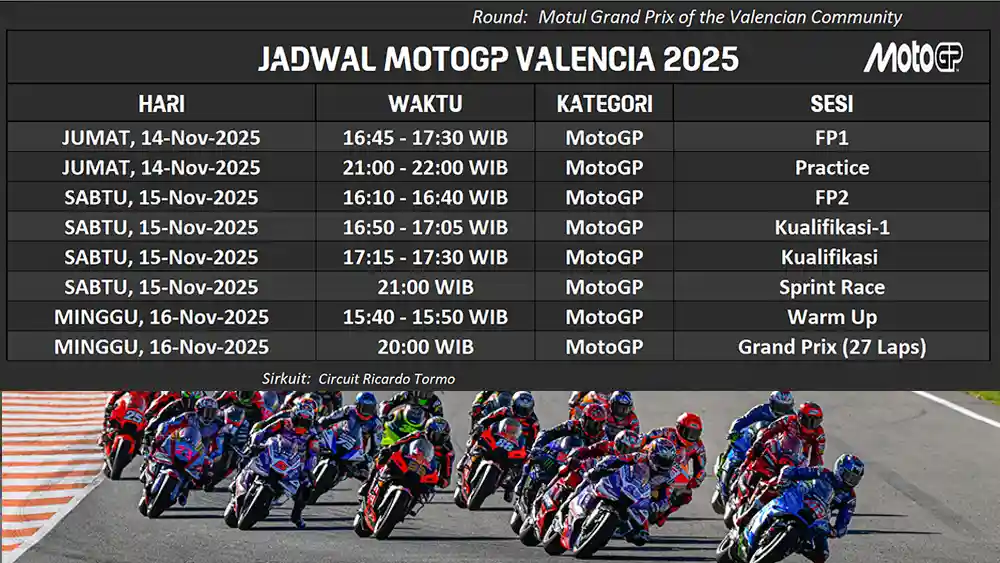 | Minggu, 16-Nov-2025 | 15:40 – 15:50 WIB | MotoGP Warm Up |