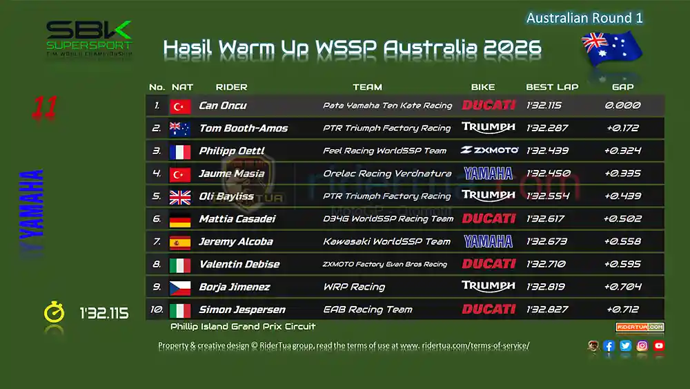 RiderTua.com, Phillip Island Grand Prix Circuit – Sabtu (21/2/2026), Hasil Warm Up WSSP Australia 2026. Can Oncu menjadi pembalap tercepat pada sesi warm up pertama WSSP Australia. Oncu (Pata Yamaha Ten Kate Racing) catat waktu terbaik di sesi ini dengan 1 menit 32.115 detik. Posisi kedua sesi pemanasanWSSP ini ditempati Tom Booth-Amos (PTR Triumph Factory Racing) yang tertinggal +0.172 dari Can Oncu. Sementara Philipp Oettl (Feel Racing WorldSSP Team) berada di P3 dengan gap +0.324.
