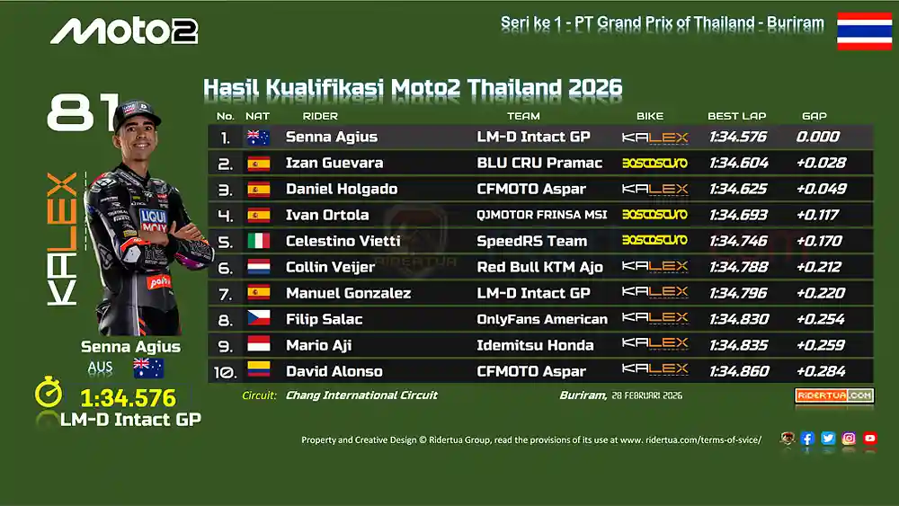 Hasil ini pun membuat pembalap asal Australia tersebut berhak start dari posisi terdepan di balapan Moto2 Thailand 2026. Di posisi kedua ada Izan Guevara, pembalap andalan BLU CRU Pramac tersebut kalah cepat dari ‘Agius’ dengan selisih waktu +0.028 detik.