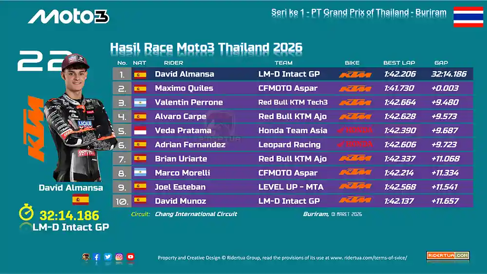 RiderTua.com, Buriram: Hasil Race Moto3 Thailand 2026 — Rider LM-D Intact GP, David Almansa, keluar sebagai pemenang Race Moto3 Thailand, Minggu (01/3/2026)… Dalam balapan kali ini, ‘Almansa’ unggul +0.003 detik saat melewati garis finis. Sementara itu podium kedua sukses diraih oleh Maximo Quiles (CFMOTO Aspar). Rider asal Spanyol itu tampil apik.. Sedangkan podium ke-3 akhirnya ditempati oleh Valentin Perrone (Red Bull KTM Tech3) dengan gap +9.480 detik…