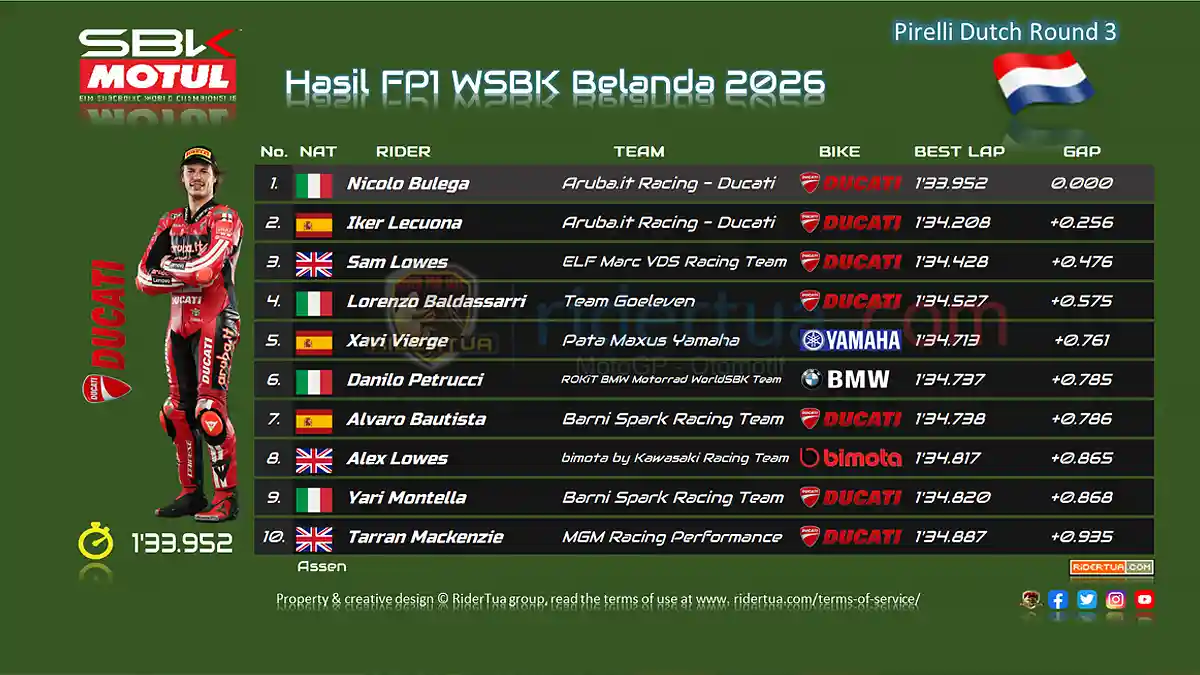 RiderTua.com, Assen – Jumat (17/4/2026), Hasil FP1 WSBK Belanda 2026. Dalam sesi FP1 WSBK Belanda Nicolo Bulega menjadi pembalap tercepat dengan 1’33.952 menit, dengan nyemplak motor Ducati Panigale V4R-nya. Pembalap asal Spanyol, Iker Lecuona menjadi tercepat kedua dengan selisih +0.256, atau dengan waktu 1’34.208 menit. Di peringkat tiga besar ada pembalap dengan nomor #14 yakni Sam Lowes dari ELF Marc VDS Racing Team dengan menorehkan waktu terbaik untuk latihan bebas pertama kali ini dengan 1’34.428 menit.