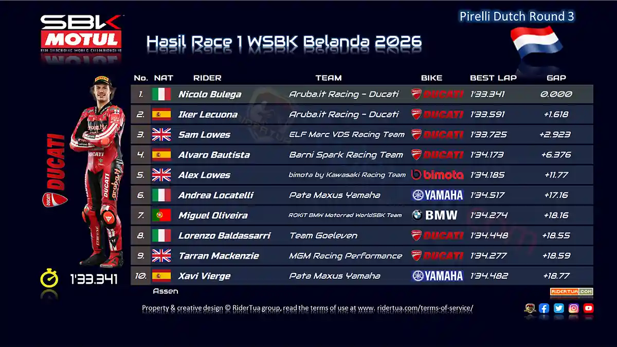 RiderTua.com, Assen – Sabtu (18/4/2026), Hasil Race 1 WSBK Belanda 2026. Pembalap Aruba.it Racing – Ducati, Nicolo Bulega, berhasil memenangi race 1 WSBK Belanda di Sirkuit Assen setelah sedikit duel dengan Lecuona di akhir balapan. Namun di akhir race Lecuona akhirnya dilibas balik dan Iker Lecuona (Aruba.it Racing – Ducati) harus puas di posisi kedua dengan selisih waktu +1.618 detik.. Sementara pembalap ELF Marc VDS Racing Team, Sam Lowes, di posisi ketiga dengan gap +2.923 detik.