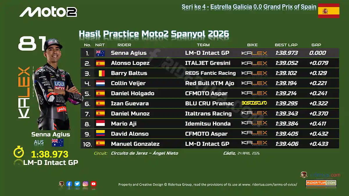 RiderTua.com, Jerez de la Frontera — Hasil Practice Moto2 Spanyol 2026, 14 pembalap yang lolos ke Q2…Rider Kalex, Senna Agius menguasai latihan Moto2 Spanyol 2026 yang digelar di Sirkuit Circuito de Jerez – Ángel Nieto pada Jumat (24/4/2026)…. ‘Agius’ berhasil mencatatkan waktu tercepat yakni 1 menit 38.973 detik.