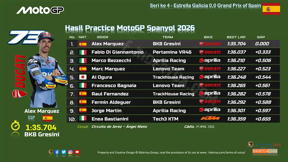 RiderTua.com, Jerez de la Frontera — Hasil Practice MotoGP Spanyol 2026… 10 rider yang lolos ke Q2… Alex Marquez membuka latihan MotoGP dengan menjadi yang tercepat pada hari Jumat (24/4/2026)…. Rider BK8 Gresini itu sukses menorehkan waktu terbaiknya di angka 1 menit 35.704 detik. Beberapa rider sempat crash dan harus menata kembali motornya agar segera bisa mencatatkan waktu terbaiknya seperti Pecco & Martin..
