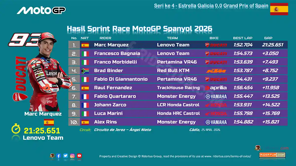 RiderTua.com, Jerez de la Frontera — Hasil Sprint Race MotoGP Spanyol 2026 : Sabtu (25/4/2026), Pembalap asal Spanyol Marc Marquez tampil perkasa dan mengamankan kemenangan di Sprint MotoGP Spanyol 2026 bersama Lenovo Team dalam kondisi hujan.